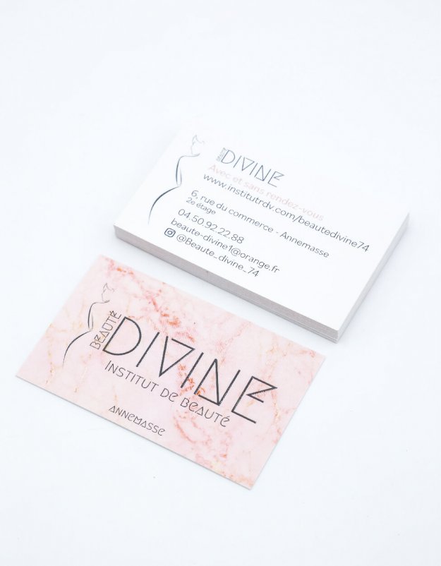 Carte de visite pour l’institut de beauté Beauté Divine, basé à Annemasse. Impression recto-verso vertical, sur papier 350g/m2, avec pelliculage soft-touch et vernis sélectif 3D.