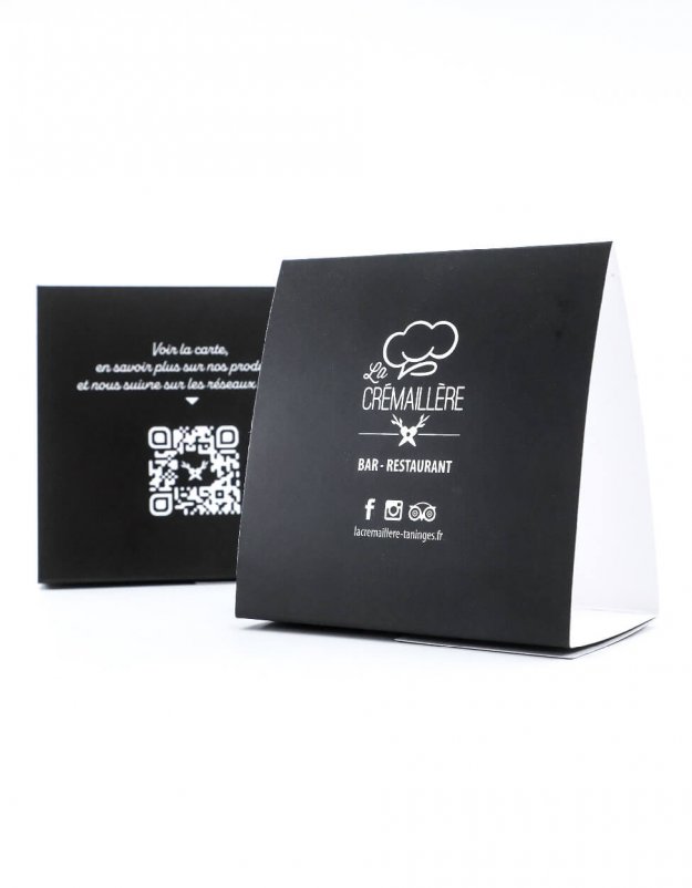 Chevalet de table 10x5x10cm avec QR code renvoyant vers une page dédiée du site www.lacremaillere-taninges.fr pour le restaurant La Crémaillère à Taninges.