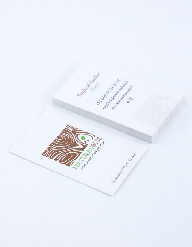 Carte de visite pour l’entreprise de menuiserie et de paysage Naturaubois, basée à Samoëns. Impression recto-verso vertical, sur papier 350g/m2, avec pelliculage soft-touch et vernis sélectif 3D.