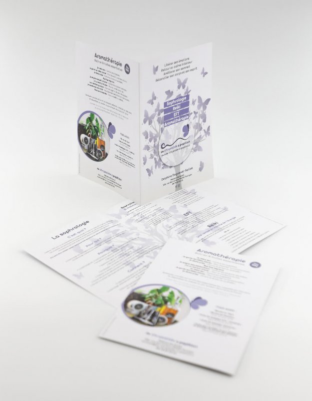 Dépliant de présentation du cabinet de sophrologie De Chrysalide à Papillon à Taninges. Format fermé : A5, 2 volets, 1 pli, sur papier 250g/m2 brillant.