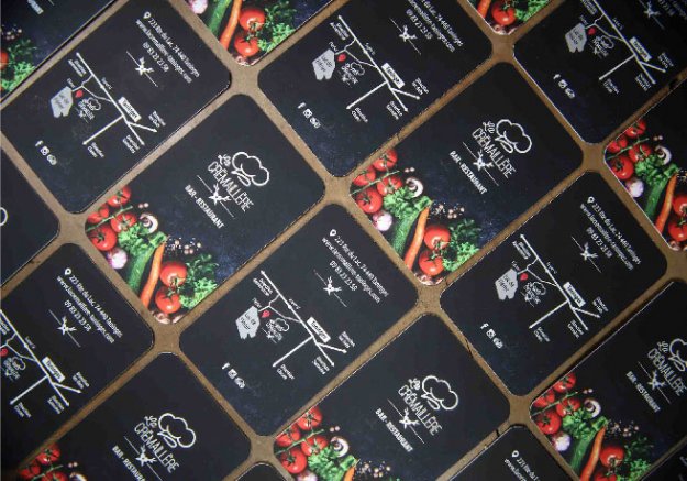 Refonte graphique et impression des cartes de visite pour le restaurant La Crémaillère à Taninges. Format 8,5 x 5,4 cm, quadri recto-verso, sur papier couché mat 350g, avec coins arrondis, pelliculage soft-touch et vernis sélectif 3D.