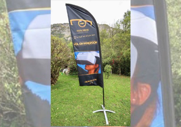 Création graphique et impression oriflamme 3m pour Visio Drone, pilote de drone agréé basé à Annecy. Forme droite sur mât élastique en aluminium, tige en acier, avec pied croisillon et housse de transport.