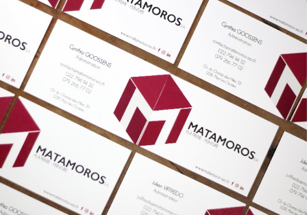 Création graphique et impression chemise à rabat pour l’entreprise de plâtrerie et de peinture Matamoros SA, basée en Suisse. Format A4 recto-verso, sur papier 350g couché mat. Rainage double avec encoche porte carte horizontale.
