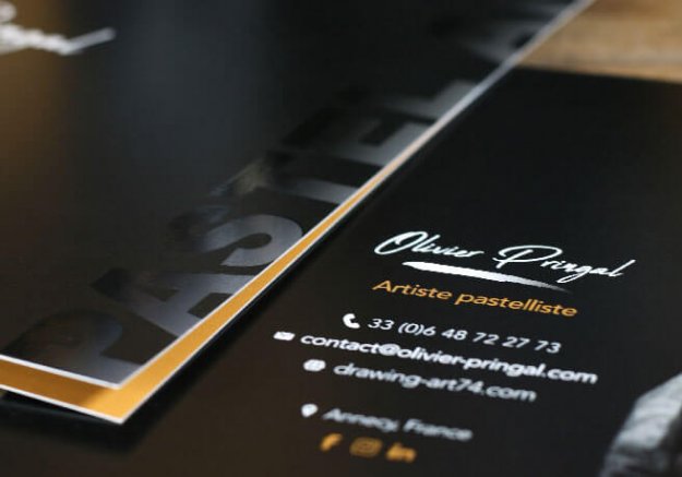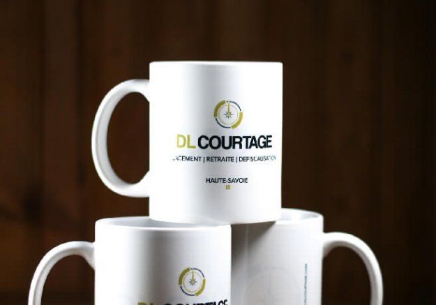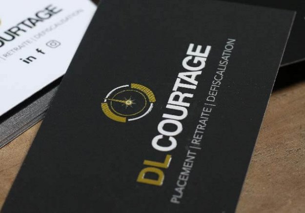 Création graphique et impression de supports de communication pour le cabinet de courtage DL Courtage, basée à Taninges. Carte de visite 8,5×5,4 cm recto verso, 300g couché mat avec pelliculage recto-verso et vernis sélectif 3D, et flyer A5 recto-verso sur papier couché 270g.