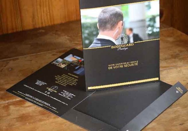 Création graphique et impression chemise à rabat A4, 2 volets, rainage simple. 350g demi-mat, quadri recto/verso, pelliculage mat recto/verso avec porte carte.
