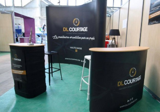 Création du stand DL Courtage pour la Foire Internationale de la Roche-sur-Foron 2019. Stand de 15m2 carré avec l’impression d’un roll-up 85×200, un comptoir pop-up 95x154cm, un stand parapluie PVC 250x200cm et des affiches A3.