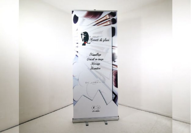 Création et impression d’un roll-up 80x200cm pour l’institut de beauté Beauté de Glace. Autres projets distillés pour Beauté de Glace :