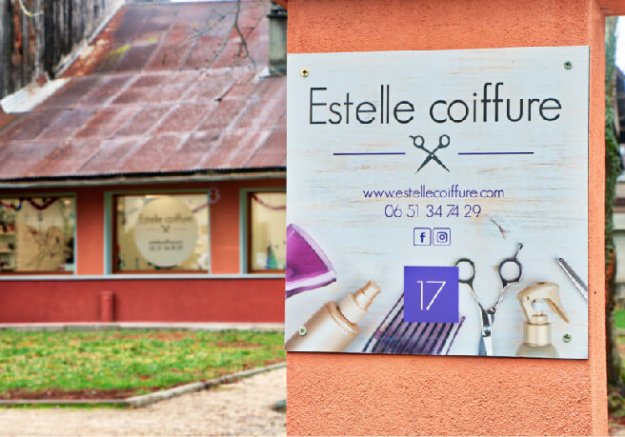 Création graphique et impression signalétique et vitrine pour l’ouverture du salon de coiffure Estelle Coiffure à Scionzier. Une bâche PVC 200x70cm, trois panneaux dibond 3mm 300x80cm, 70x30cm et 30x30cm. Impression et pose du sticker sur la vitrine par BS Evolution.