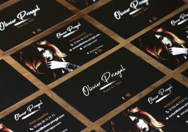 Création graphique et impression des cartes de visite d’Olivier Pringal, artiste pastelliste. 8,5×5,4 cm sur papier couché mat 300g, avec pelliculage et vernis sélectif.