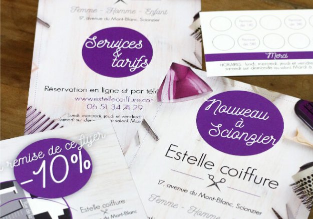 Création graphique et impression de supports de communication pour l’ouverture du salon de coiffure Estelle Coiffure à Scionzier. Flyer de prospection 10x15cm, couché mat 300g, flyer services et tarifs 10x21cm, couché mat 170g et carte de fidélité 8,5×5,4cm.