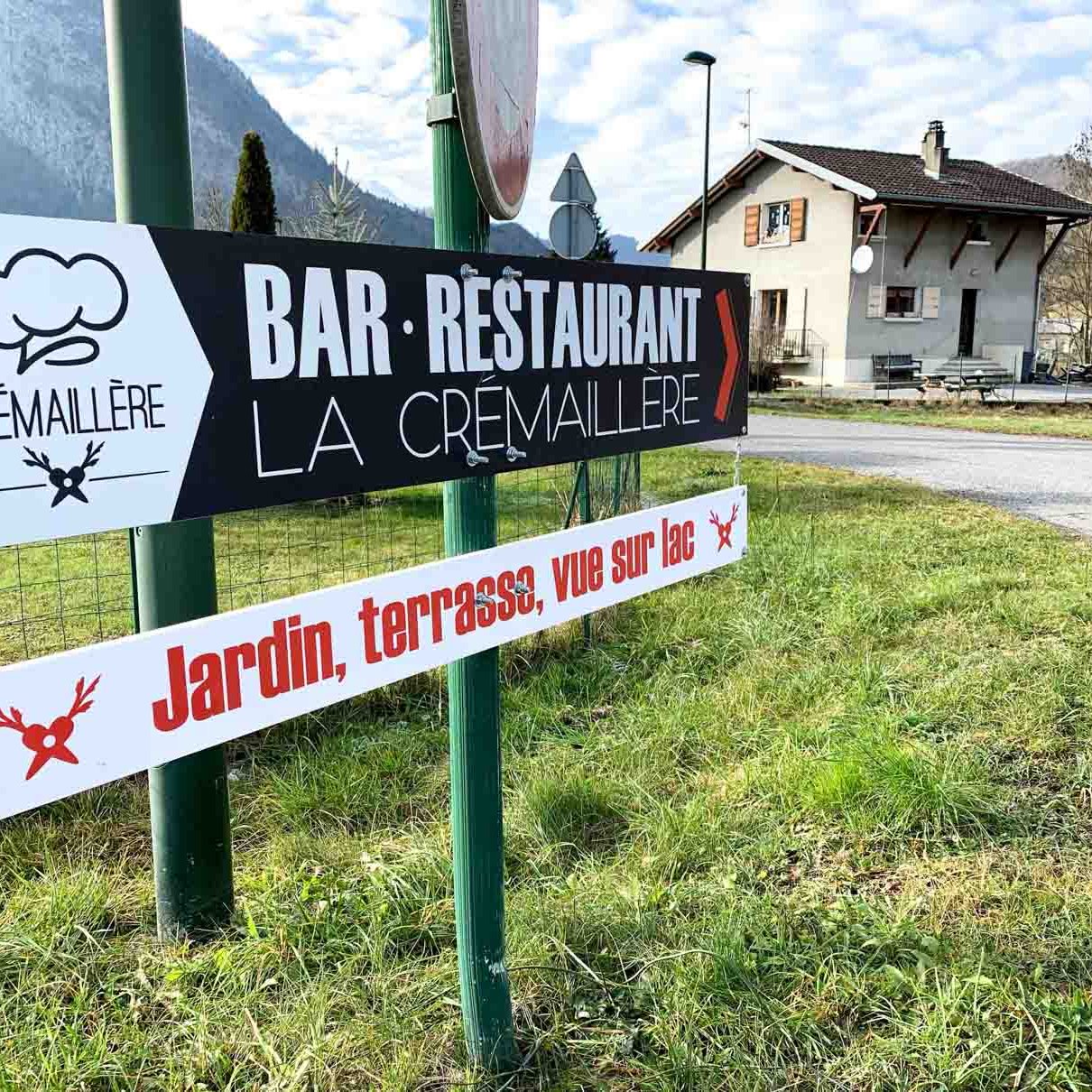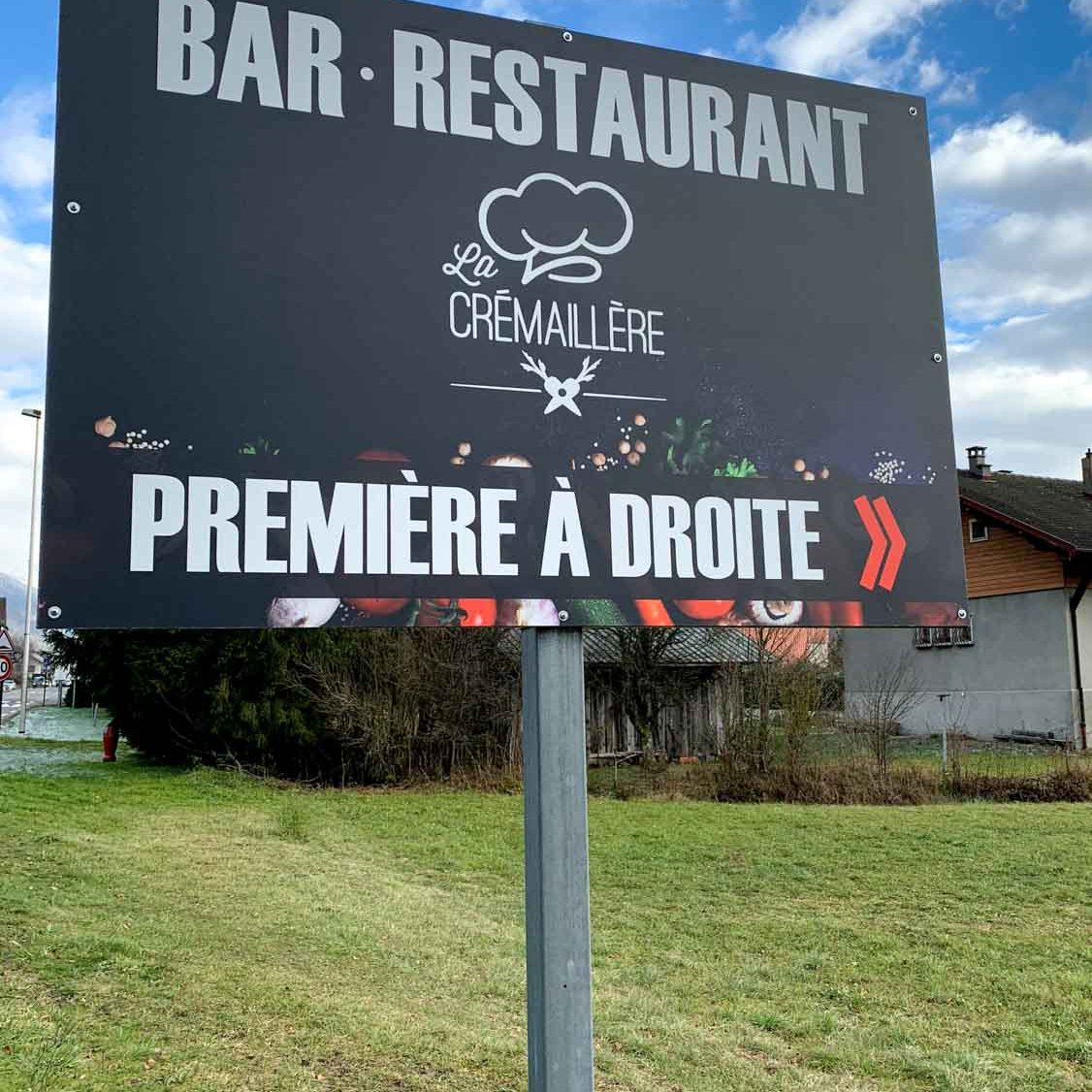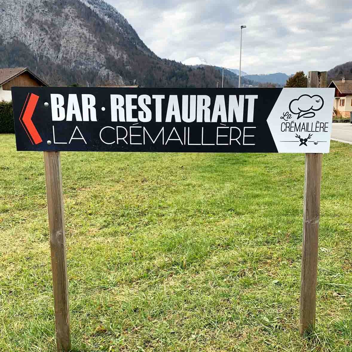 Création graphique et impression des panneaux signalétique et de l’enseigne pour le restaurant la Crémaillère à Taninges. 7 panneaux de 150x30cm, 1 de 150x110cm et une enseigne de 250x125cm sur dibond 3mm.