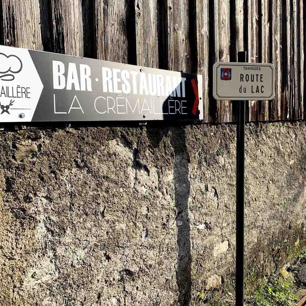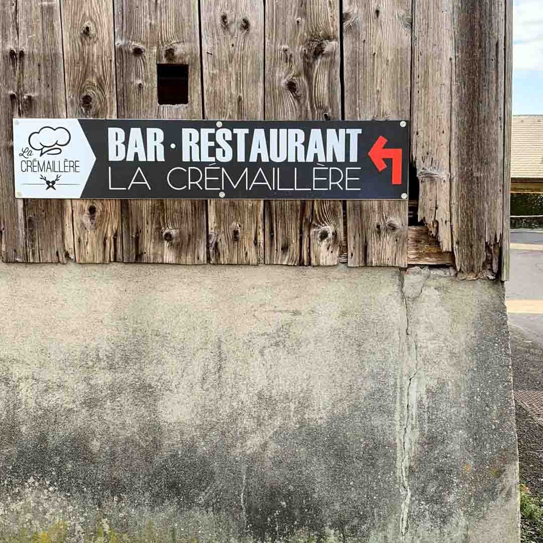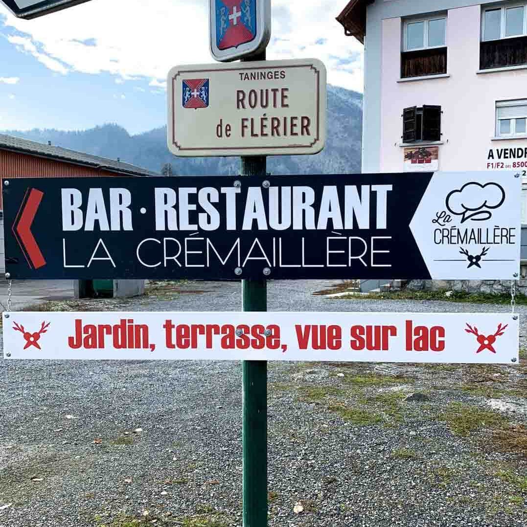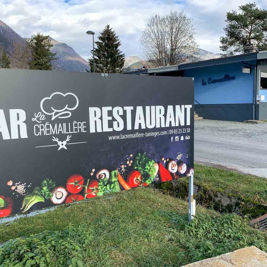 Création graphique et impression des panneaux signalétique et de l’enseigne pour le restaurant la Crémaillère à Taninges. 7 panneaux de 150x30cm, 1 de 150x110cm et une enseigne de 250x125cm sur dibond 3mm.